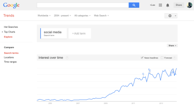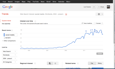 Around a year has passed since I took the screen shot below illustrating the exponential growth of social media (coinciding with phenomenal growth of Google and the Internet as a serious tool for business and communication):