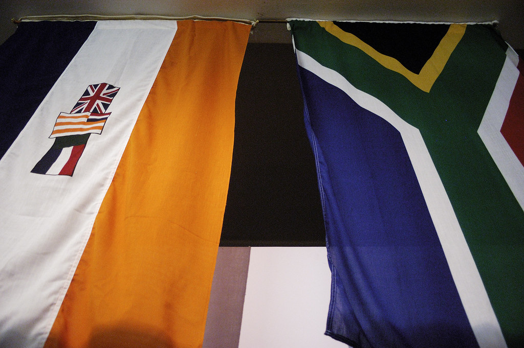 Image via Creative Commons “East London Museum” by Chris Bloom; Old Flag on the left, current South African flag on the right.