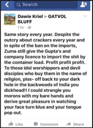In terms of expression B, according to media reports, Mr. Kriel pleaded guilty to a charge of crimen injuria, and was sentenced to a fine of R6 000, or 12 months’ imprisonment, suspended for five years. As an aside, see further, Penny Sparrow– also charged and convicted of crimen injuria, in addition to criminal prosecution, she was also found liable by the Equality Court to pay civil damages; and Adam Catzaveloswho is facing criminal and civil action for racist comments.
